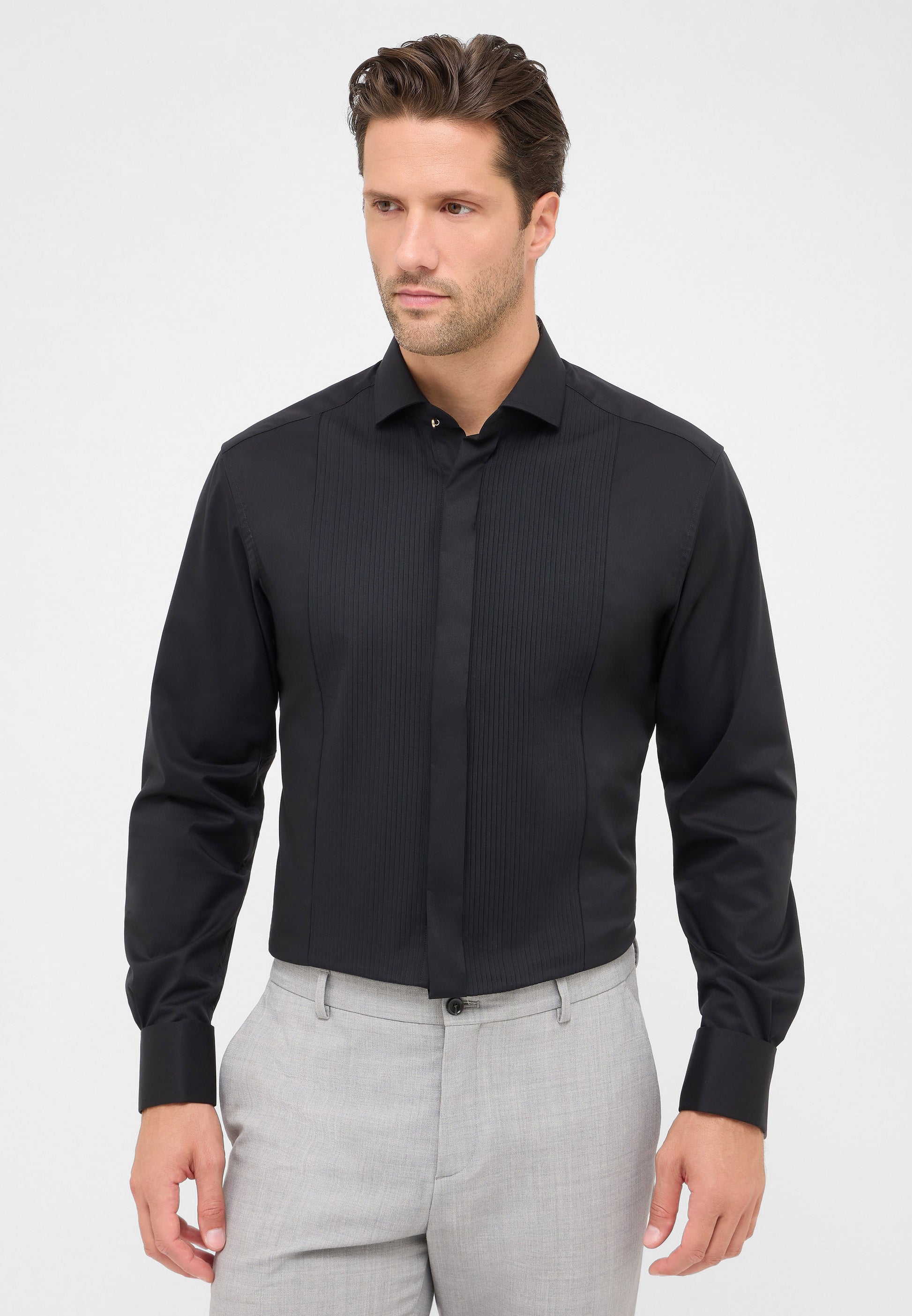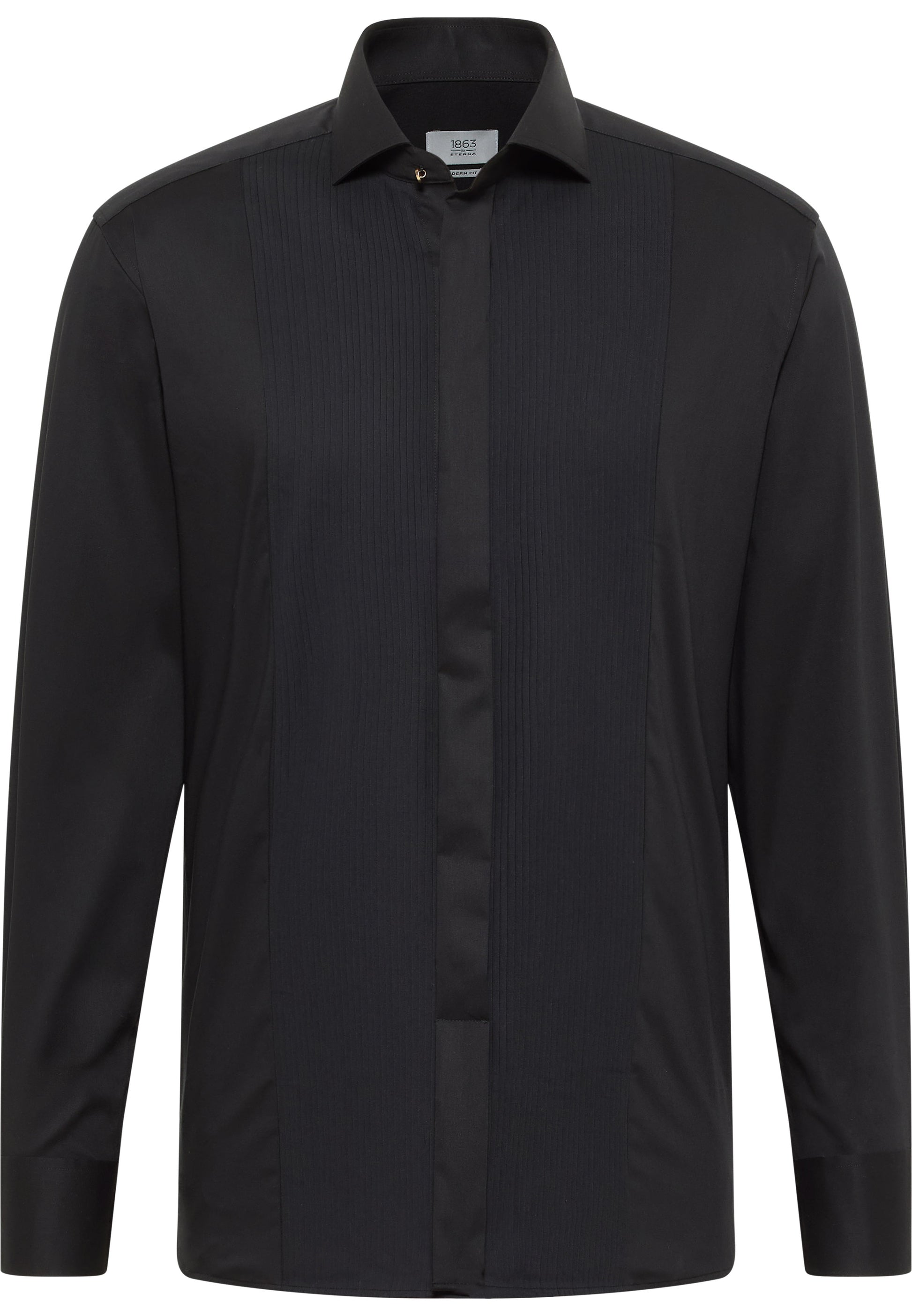 Crafted in luxurious black twill, this formal shirt is tailored for distinguished occasions. Featuring a pleated front, French cuffs, and a concealed placket, it offers timeless elegance. Made from 100% non-iron cotton, it ensures a crisp, refined look with effortless maintenance.